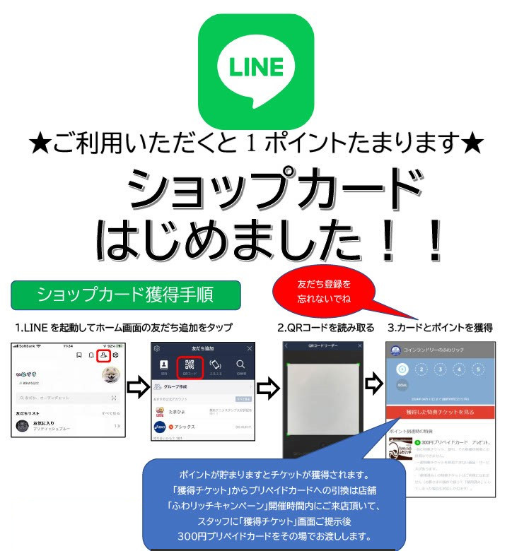 洗濯乾燥機・乾燥機・縦型洗濯機・スニーカーランドリーのいずれかをご利用後、店頭に掲載されておりますQRコードを読み取りますと、1ポイント付与されます。