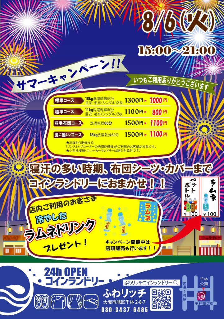 洗濯乾燥コースの割引と冷やしたラムネドリンクをプレゼント!!
