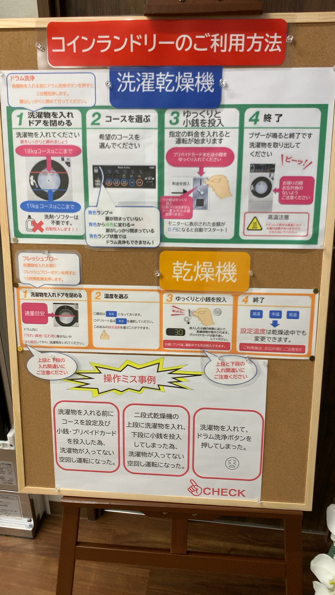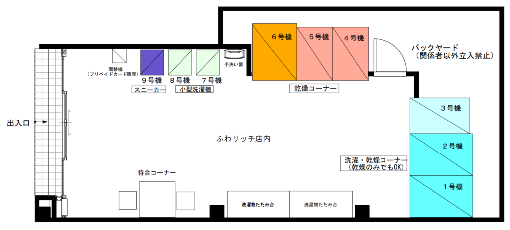 - 機械故障以外の洗濯物に対する縮み、色落ち・移染・衣類(布団)破損などの責任は一切負いかねます。店側は賠償責任を負いませんので、お客様の自己責任の上でご利用ください。洗濯物盗難などのトラブルは、お客様が警察へ盗難届をお出しください。
