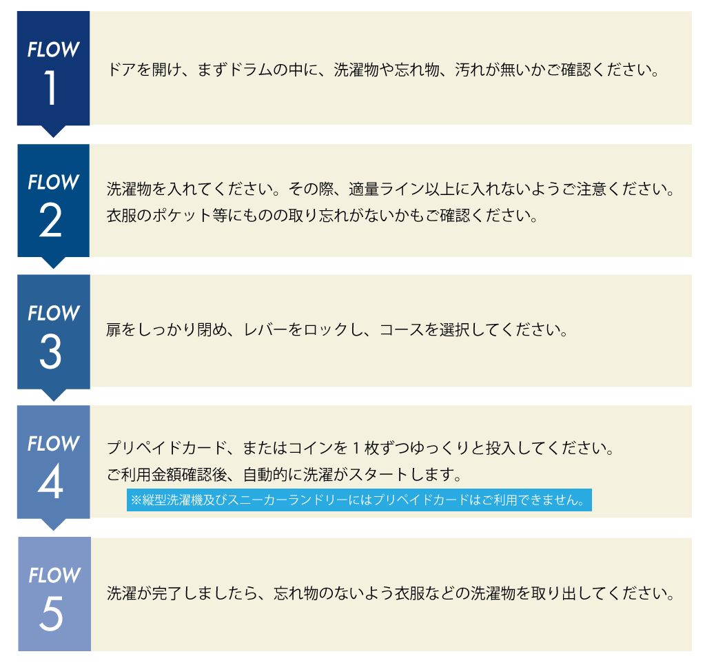 - し尿の付着したおむつ・運動靴・動物の敷物・油のついた衣類等は、後で使う人に不快感を与えたり不潔になったりしますので洗濯しないで下さい。(※靴は専用のスニーカーランドリーをご使用ください。)